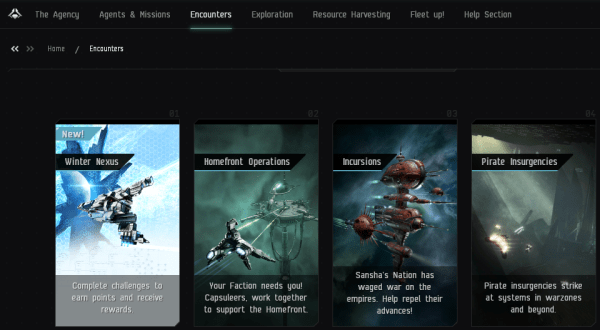 Then there are the in-game events, which include exploration sites, combat sites, and ice mining sites, each with their own set of goals. That can be found in The Agency under encounters.