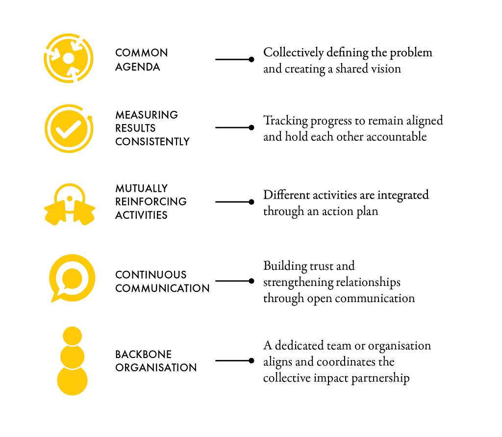 The Collective Impact Forum helps organisations reap the benefits of collective action. Based on their work with communities, they developed a collective framework, setting out five conditions for aligning the different end goals of partners.